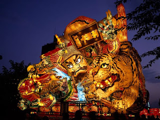 A brilliantly decorated lantern float stands out against the summer night sky during the Neputa Festival in Hirosaki. Often depicting warriors and shaped like fans, the floats are accompanied by traditional drums. Folk festivals featuring traditional music, dance, and costume are an important cultural element in Japan.